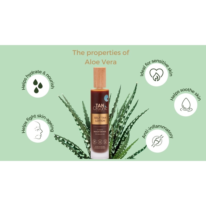 TanOrganic isepruunistav losjoon koosneb tervelt 84% mahedast Aloe Vera mahlast. See on loodud neile, kes soovivad veatut päikesesuudeldud jumet, kuid ei ole nõus tegema järeleandmisi naha tervises. Losjooni rikkalik koostis käitub nahal nagu vananemisvastane seerum, pakkudes tänu hüaluroonhappele ja ženšennile sügavat niisutust ja pinguldavat efekti.