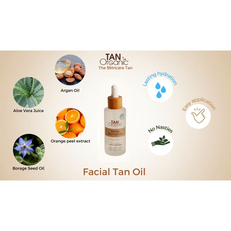 TanOrganic isepruunistav näoõli on kerge ja siidine "iluõli", mis on loodud spetsiaalselt näo, kaela ja dekoltee hooldamiseks. See ei ole lihtsalt isepruunistaja, vaid tõeline vitamiinikokteil nahale. Erinevalt tavalistest näopruunistajatest, mis võivad poore ummistada või nahka kuivatada, on selle õli alustalaks mahe Aloe Vera mahl ja väärtuslikud taimsed õlid.